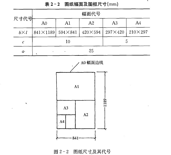 (1)为了合理使用图纸,便于装订和管理,设计者或制图人员根据所画图样的大小来选定图纸的幅面。图纸幅面及图框尺寸,应符合表2—2的规定。表中b与l分别代表图纸幅面的短边和长边的尺寸,图2一2所示为图纸尺寸及其代号。