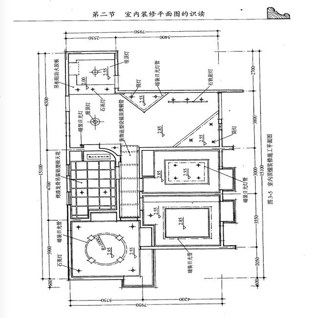 (5)通过顶棚装修系统的配套图纸,确定吊顶空间构造层及吊顶面所设音响、空调送风、灯具及烟感器和喷淋头等的布置位置、隐蔽或明露要求以及它们各自的装设构造做法,明确工种分工,工序安排和施工步骤。