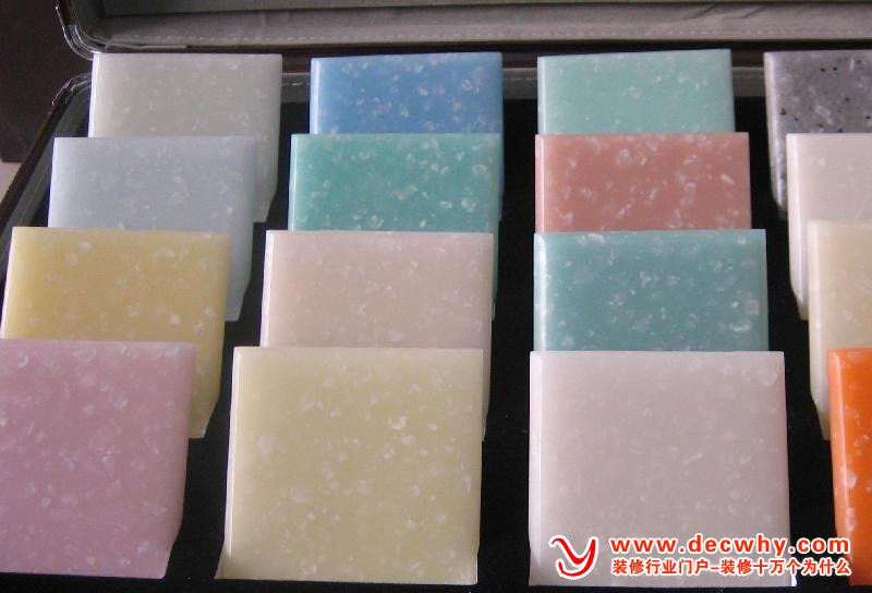 人造石是在一些化学原料中加入颜料、填料、添加剂而形成的石材。这种石材的表面光滑整洁,没有气孔和麻面,色彩艳丽,而且有一定的透明度。这种石材表面的颗粒具有悬浮的感觉。