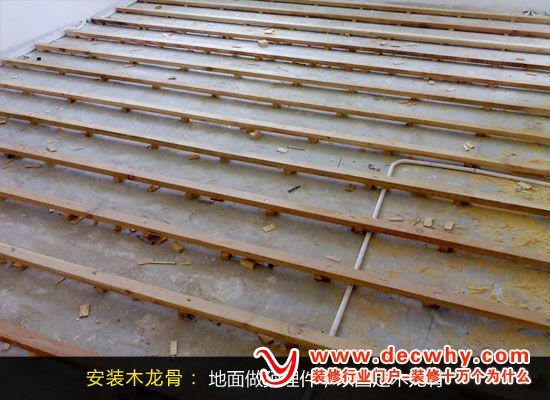 (2)施工人员会根据房间窗户主光线的射入方向和大家的要求,来确定木龙骨的铺殴方向,木龙骨的铺设方向应和地板呈十字垂直状态。