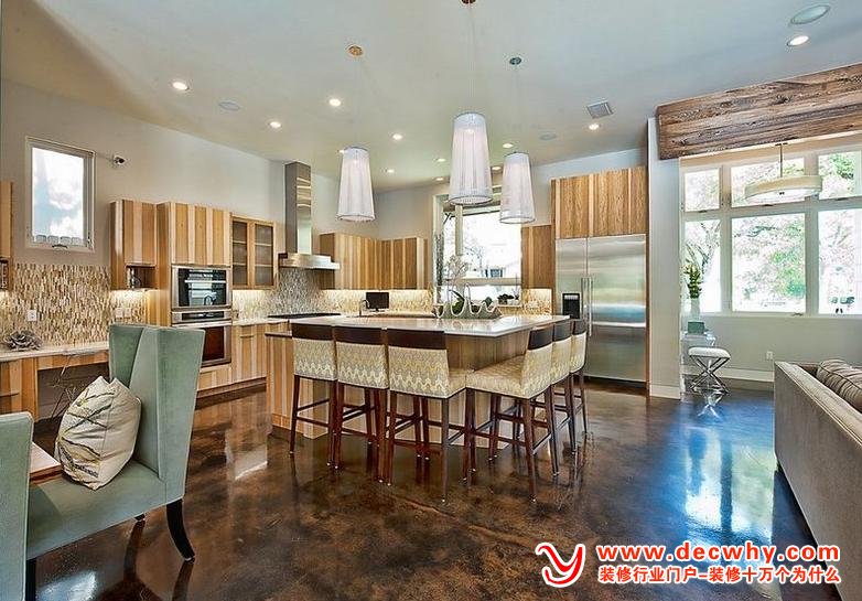 3、视觉:比如我们可以通过吊顶来进行划分,进行地板来铺设不同颜色,不同材质或者不同高度的材料来进行有效的划分,这样能够在视觉上让餐厅显得独立,同时又有效的融合在一起。除此之外,我们也可以通过不同的色彩,不同的灯光,或者通过一些透明的隔断能够分离出就餐区,只要想得到的,我们都可以进行尝试,独立而又整合,是餐厅的装修要点。