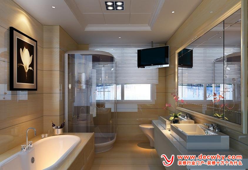 卫生间吊顶采用整面玻璃镶嵌,可以增强空间感与瓷砖和灯光相结合,置身其中使人有一种进入梦幻世界的感觉。如果用玻璃隔断、桑拿板吊顶、玻璃马赛克,泡浴用的木桶就象放在沙滩上的一叶小舟,细长滴落的流水带着花瓣顺着光滑曲动的木桶流淌而下,缓缓从铺着鹅卵石的地漏中流走。