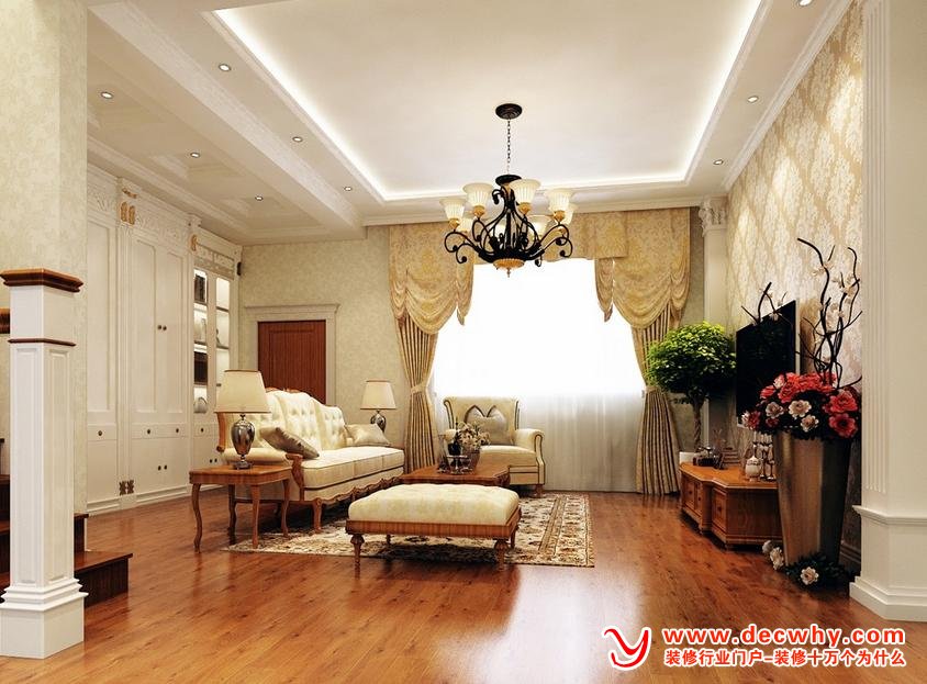 此种吊顶可用木材夹板成型,设计成各种形状,再配以射灯和筒灯,在不用吊顶的中间部分配上较新颖的吸顶灯,会使人觉得房间空间增高了,尤其是面积较大的客厅,效果会更好。