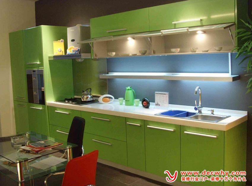 在选择橱柜的时候,还可以选择柔和的仿木纹柜门、水晶板等中高档材料的成品柜,虽然价格比较高,但是却能使你的厨房得到与众不同的装饰效果。