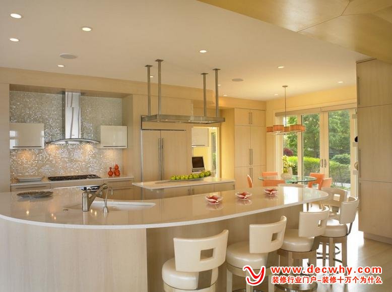 现在的户型设计,多将厨房面积加大,或是与餐厅连为一体,许多人也仿效国外的厨房设计,把厨房设计成餐厨一体化,甚至是餐厨客一体化。这种设计固然有其积极的一面,主妇在操劳时,在她的视线中始终有家人的陪伴,很人性化。但考虑到国人的饮食习惯,专家建议这种设计还是慎用,尤其是喜欢在家享用美食的人士。如果真是就喜欢这种风格设计,不妨改良一下,可以把烹饪灶台“关闭”起来,四周用玻璃材质,既不挡视线,也可以阻隔油烟。