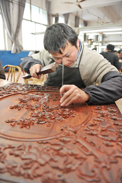 图为工匠精心雕刻