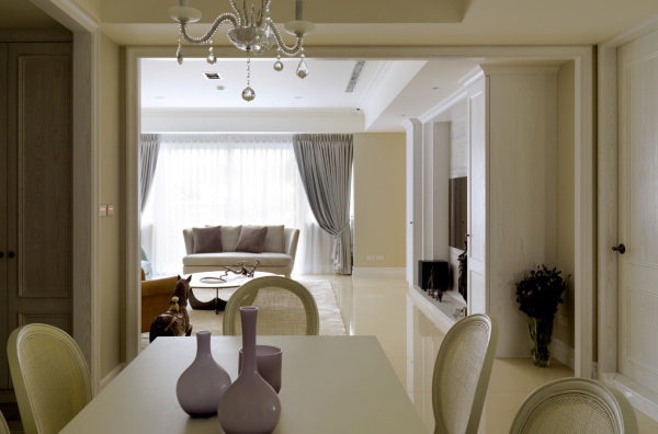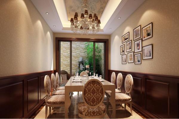 4.小型独立餐厅一般难以形成良好的封闭用餐环境。该方法通过在小餐厅上方的小屋顶上制作一个小方形屋顶来解决这个问题,以减少用餐空间,创造餐厅的封闭用餐氛围。同时,天花板与枝形吊灯相结合。