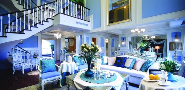 3.以上图片色装饰效果图。蓝色使房间非常明亮,在神经调节和神经平静方面也起作用。蓝色清新典雅,有几种水果,非常醒目,但不应用于餐厅或厨房。餐桌或蓝色桌布上的食物总是比温暖的气氛少开胃。