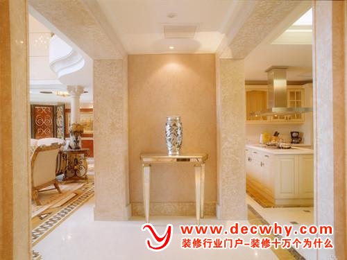 玄关部分的墙面往往与人的视距很近,常常只作为背景烘托。可以用水彩木质壁饰或喷刷浅色的乳胶漆。切记要点到为止,不宜过多修饰。