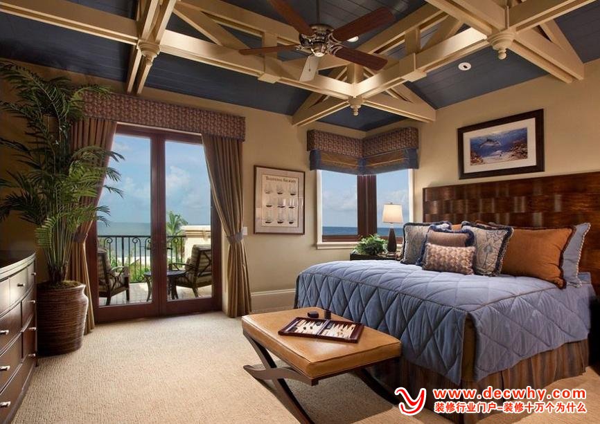 由于卧室家具较多,空间显得拥挤,所以植物的选用以小型、淡绿色为佳。配套的盆景也不宜色彩鲜艳、造型奇特。可在案头、几架上摆放文竹、龟背竹、蔗类等。如果空间许可,也可在地面摆上造型规整的植物,如心叶喜林芋、巴西铁、伞树等。另外,可根据中老年