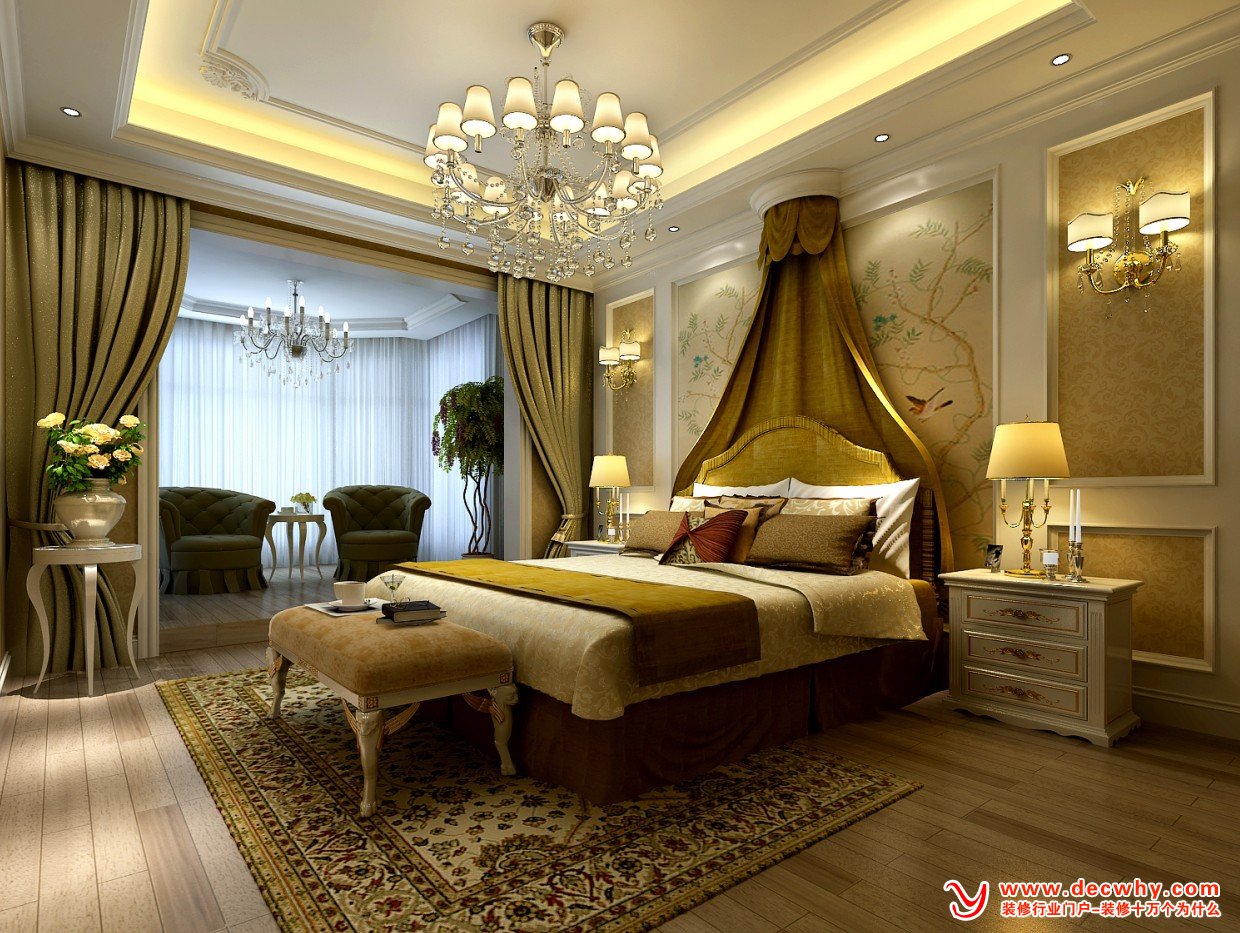 卧室的灯光照明以温馨和暖的黄色为基调。卧室中的普通照明需注意的是灯光要柔和、温馨、有变化,避免采用室内中央的惟一大灯,光线勿太强或过白,因为这种灯光常使卧室内显得呆板没有生气,如果选用天花板吊灯时,则必须选用有EN色光度的灯具,并配以适当的灯罩,否则悬挂笨重的灯具在天花板上,光线投射不佳,室内气氛大打折扣。